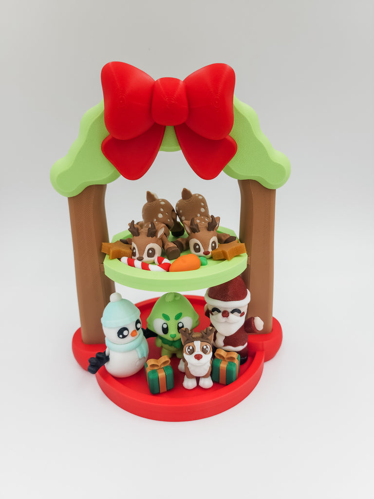 Showcase your festive favorites with flair! This handcrafted, 3D-printed Christmas Tree Display Stand is designed to elevate your child's playdough creations, fidget clickers, and flexible Christmas figurines. With two charming tiers in soft red and minty green, light brown sides that mimic a tree trunk, and whimsical treetop accents crowned by a red bow, it’s a storytelling centerpiece that kids will adore.