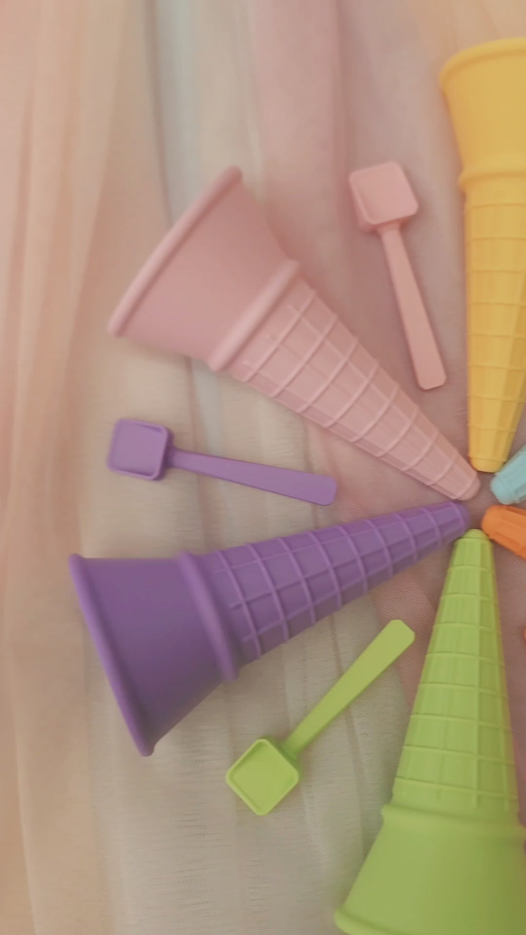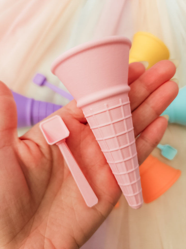 - 6 pastel coloured ice cream cones and 6 ice cream spoons, as pictured (does not include any sweet treat accessories or playdough).