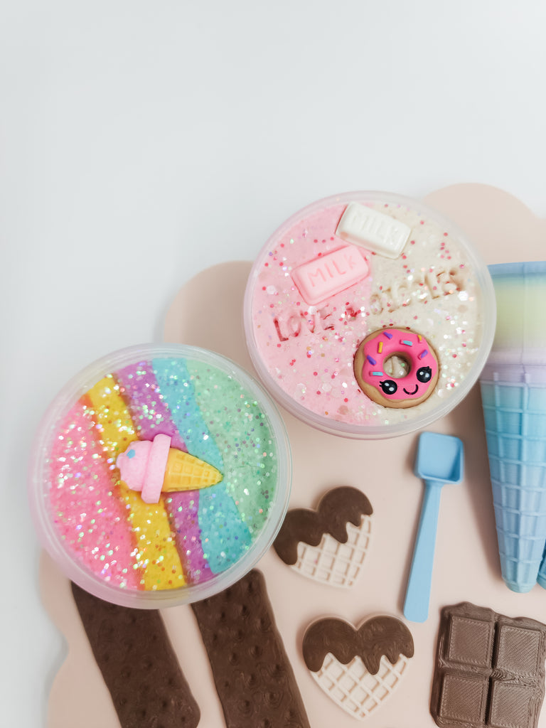 • 2 (160g) of our Strawberry Vanilla and Rainbow Ice Cream Luxe playdough, as pictured
